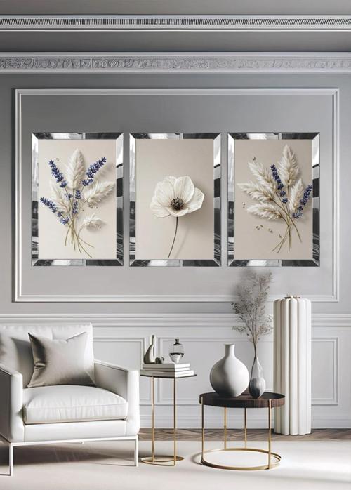Pleksi Çerçeveli Lavanta Pamuk Tablo 3lü Özellikleri Materyal : 4 mm Mdf üzeri uv baskı ve 1 mm Gümüş & Gold aynalı pleksiden imal edilmektedir.