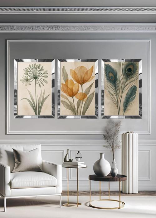 Pleksi Çerçeveli Tavus Kuşu Tüğü & Çiçek Tablo 3lü Toplam Kapladığı Alan 120x60 cm, 90x45 cm ve 60x30 cm dir.