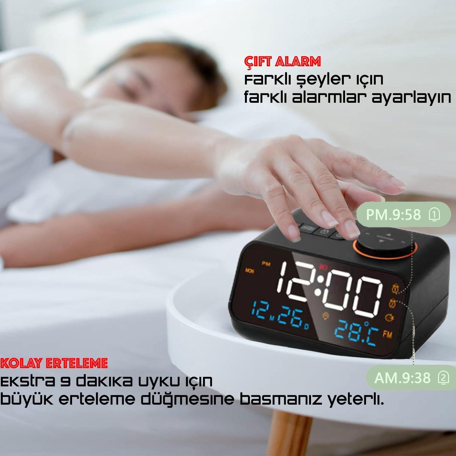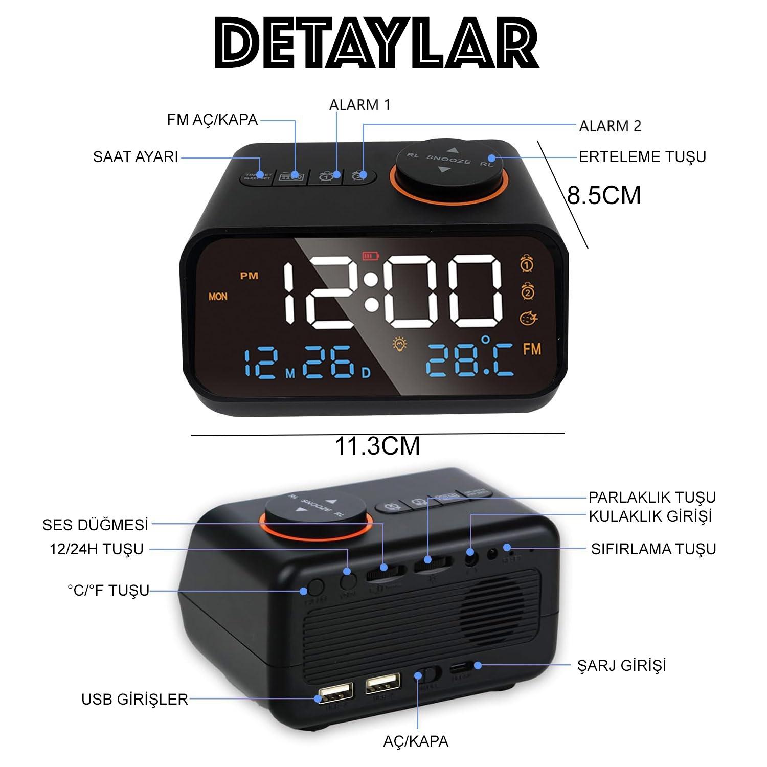 - BAĞLANTI NOKTALARI: Elektronik saat ayrıca akıllı telefonunuzu şarj etmek için 2 dahili USB bağlantı noktasına ve radyo sesini daha iyi dinlemek için bir kulaklık girişine sahiptir.
