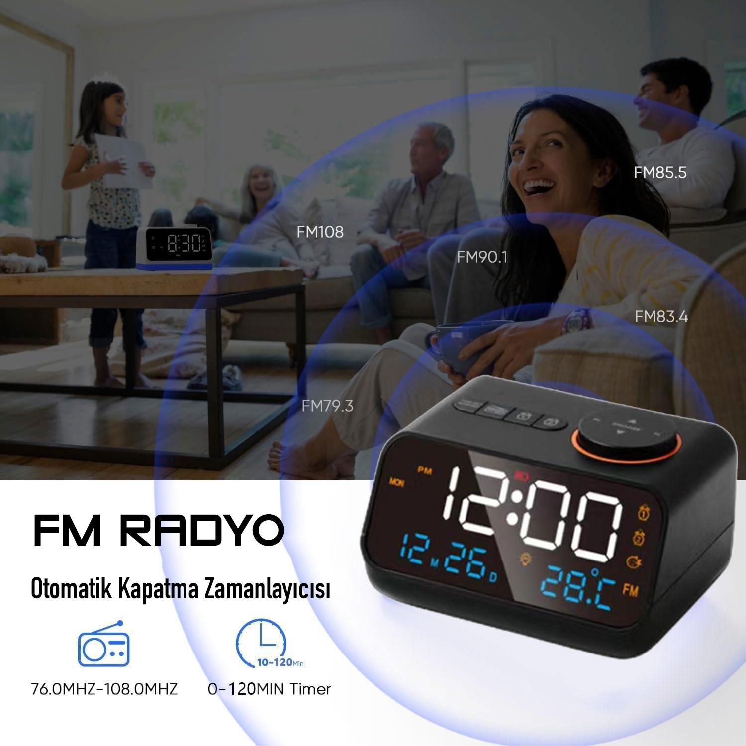 - FM RADYO: Bu radyolu çalar saat, güçlü bir VHF ile donatılmıştır. FM saatli radyo, en sevdiğiniz kanalları dinlemek için mükemmel ve istikrarlı bir sinyal kalitesine sahiptir. Frekans aralığı: FM 76.0-108.0MHz, kanalları ve radyo istasyonlarını otomatik olarak tarayıp kaydedebilir.