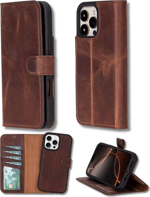Apple iPhone 16 Pro Max uyumlu, Hakiki Deri, El Yapımı, Cüzdanlı Kılıf, Antik Kahve