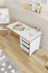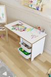 *Çekmeceler raylıdır, açılır kapanır. Özel sandalye bağlantı aparatı ile daha dayanıklı ve ergonomik sırtlık mevcuttur. Masa yüzeyi parlak beyazdır. Yaz-Sil özelliktedir. Ürün ayakları gürgen ağaçtan üretilmiştir. Zımparalı. Ayak bağlantı aparatı özel üretilmekte olup dayanıklı plastikten üretilmiştir. Daha uzun ömür ve dayanıklılık sağlar. Üründe çocukların hareketli yapısı dikkate alınarak iyileştirmeler yapılmış malzemeler kuvvetlendirilmiş veya ilave edilmiştir.
