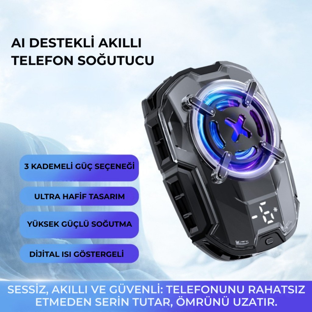 AI Destekli Akıllı Telefon Soğutucu, gelişmiş yapay zekâ destekli soğutma teknolojisi ile telefonunuzu serin tutar, performansını en üst seviyede korur ve cihazınızın ömrünü uzatır.
