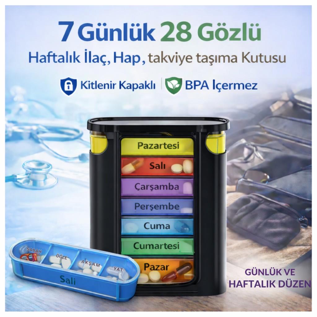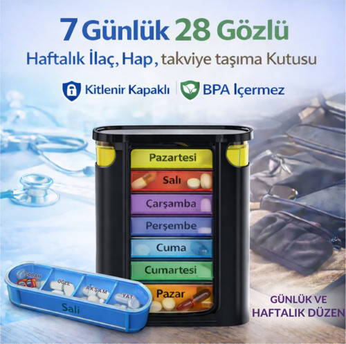 Sağlığınızı yönetmek hiç bu kadar düzenli ve kolay olmamıştı! Günlük ilaç takibini karmaşadan kurtaran 7 Günlük 28 Bölmeli İlaç Kutusu, hem evde kullanım hem de seyahatleriniz için ideal bir yardımcıdır.