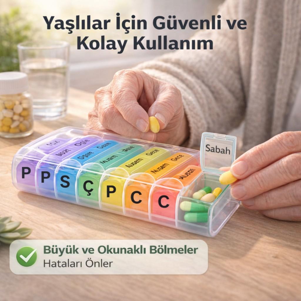 7 günlük 28 bölmeli haftalık ilaç ve takviye kutusu, ilaçlarını düzenli kullanmak isteyen herkes için pratik, güvenli ve kullanışlı bir çözümdür. Sabah – Öğle – Akşam – Gece olmak üzere günlük 4 zamanlı tasarımı sayesinde dozlarınızı asla karıştırmazsınız.
