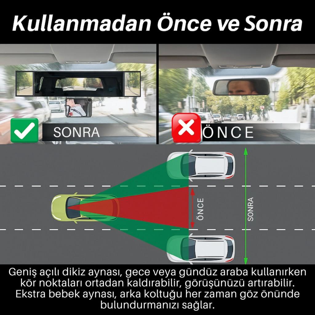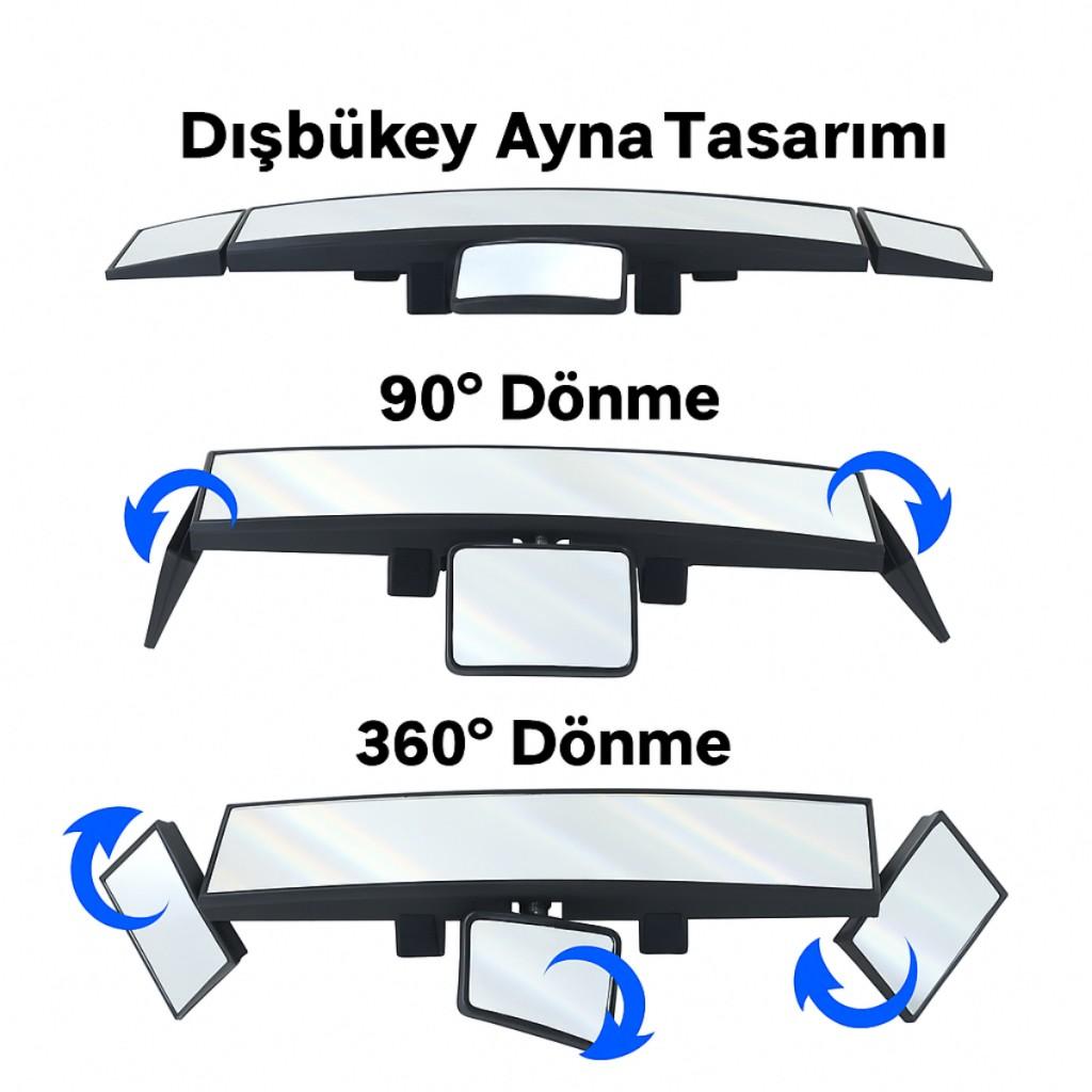 Kavisli Ultra Geniş Araç İçi Geniş Açılı Dikiz Aynası, sürüş güvenliğinizi bir üst seviyeye taşır. Standart aynalara göre çok daha geniş bir görüş açısı sunarak kör noktaları ortadan kaldırır. Ekstra yan aynalar ve arka kör nokta aynası sayesinde aracınızın etrafındaki her detayı net bir şekilde görmenizi sağlar.