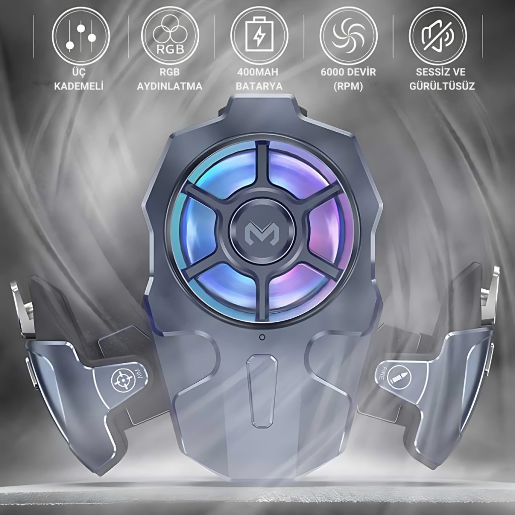 Polham RGB Işıklı 2si 1 Arada Oyun Tetik ve Telefon Soğutucu – 6000 RPM Süper Fan, 400mAh Batarya, PubG ve Call of Duty Uyumlu