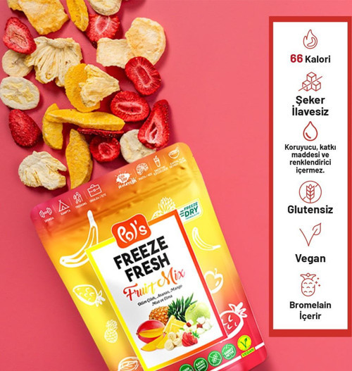 Pol’s Freeze Fresh dondurularak kurutulmuş ananas ,mango ,elma, dilim çilek ve muz iyi tarım yöntemleri ile yetiştirilen IQF (Individual Quick Freezing) ve freeze dry teknolojisi ile önce dondurulup sonra kurutulması ile elde edilen çıtır meyve atıştırmalığı alternatifidir.
