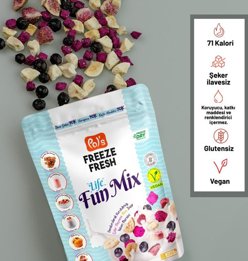 Pol’s Freeze Fresh Dondurularak Kurutulmuş Fun Mix 20 g, kontrollü tarım uygulaması ile yetiştirilen meyveler önce dondurulması sonra freeze dry teknolojisi ile kurutulması sonucu elde edilmektedir.