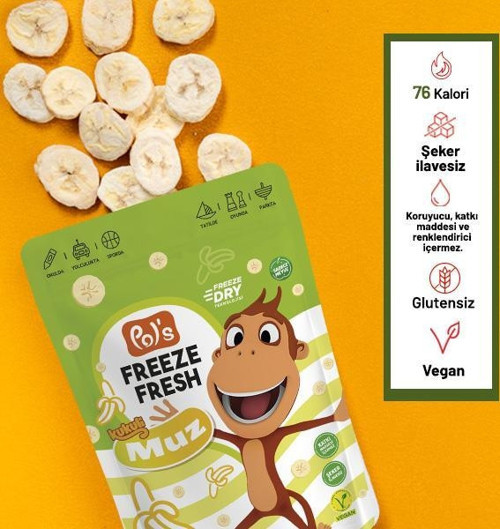 Pol’s Freeze Fresh dondurularak kurutulmuş muz, mevsiminde tam olarak olgunlaşmış muzların özenle toplanarak Pol’s üretim tesisinde Freeze dry teknolojisi ile önce dondurulup sonra belirli sıcaklık altında kurutulması ile üretilen doğal, katkısız ve sağlıklı atıştırmalık meyve atıştırmalığıdır. Yediden yetmişe her kesim tarafından severek tüketilen Pol’s Freeze Fresh dondurularak kurutulmuş muz doğrudan tüketilebildiği gibi çeşitli yiyecek ve içeceklerin içerisine karıştırılarak da kullanılabilir.