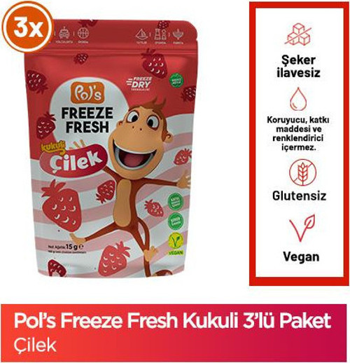 Pol’s Freeze Fresh dondurularak kurutulmuş çilekler, kontrollü tarım uygulaması ile yetiştirilen çileklerin önce dondurulması sonra freeze dry teknolojisi ile kurutulması sonucu elde edilmektedir.