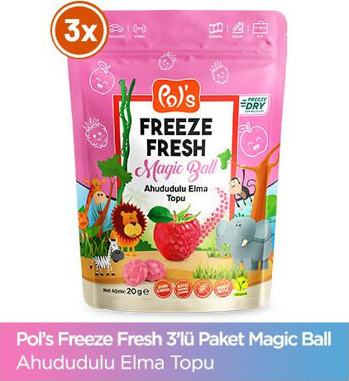 Pol’s Freeze Fresh dondurularak kurutulmuş ahududulu elma topları , kontrollü tarım uygulaması ile yetiştirilen çileklerin önce dondurulması sonra freeze dry teknolojisi ile kurutulması sonucu elde edilmektedir.