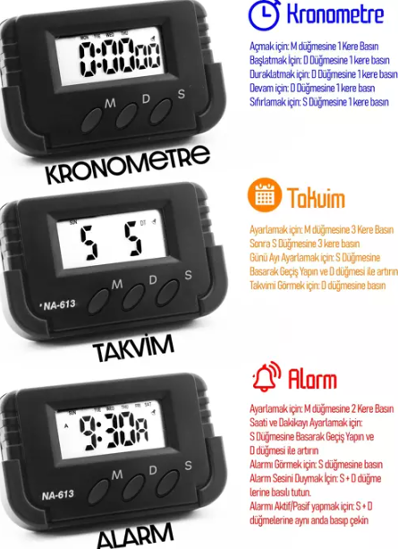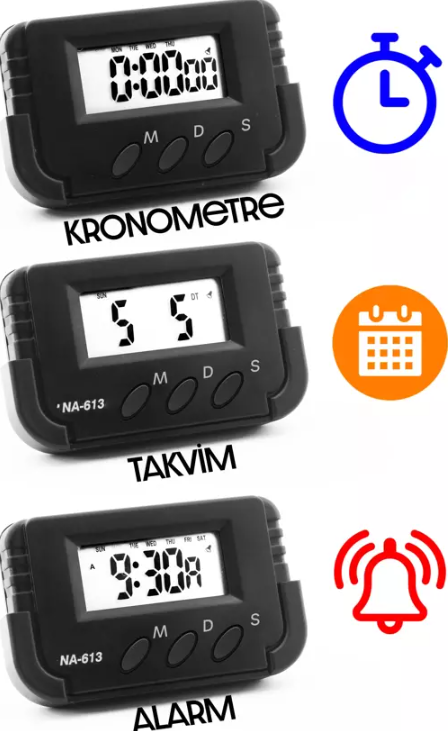 Modern ve şık tasarımıyla her ortama uyum sağlayan NA-613D Dijital Masa Saati, sadece zamanı göstermekle kalmıyor, aynı zamanda kronometre, takvim ve alarm fonksiyonlarıyla da hayatınızı kolaylaştırıyor.