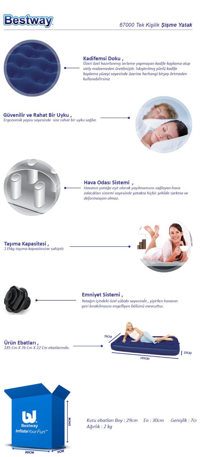 Bestway 67000, Tek Kişilik Şişme Yatak (185x76x22 cm) Ev-Kamp yatağı