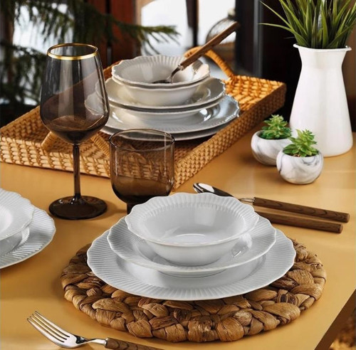 Bu yemek takımı, modern tarzın sadeliğini ve zarif rölyefli dokunuşları bir araya getirerek sofralarınıza benzersiz bir şıklık katıyor. Porselenin sağlamlığıyla birleşen özel tasarımı, her parçada zarafetin izlerini taşıyor.