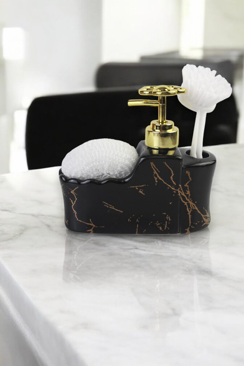 Porselen Sıvı Sabunluk Siyah Mermer Desen Fırçalı 300ml
