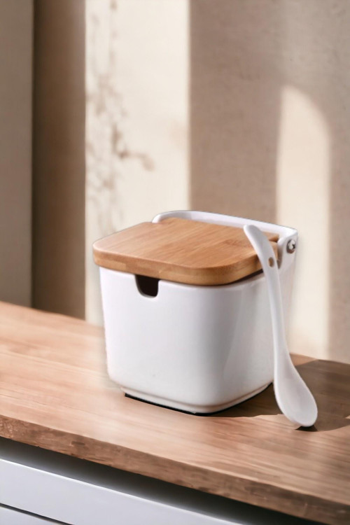Premium Porselen Tezgah Üstü Tuzluk Kaşıklı Baharatlık Bambu Kapak