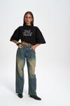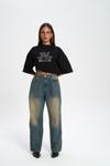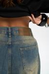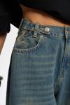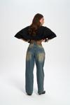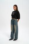 Rahat formda, uzun ve geniş paçalı. Orta bel yükseliği, kemerinde düğme ve brit detaylı denim pantolon.