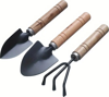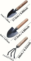 3 parça mini bahçe alet seti, tohum ekmek, sukulentler ve saksı malzemeleri için ahşap saplı çiçek tırmığı ve küçük kürek.