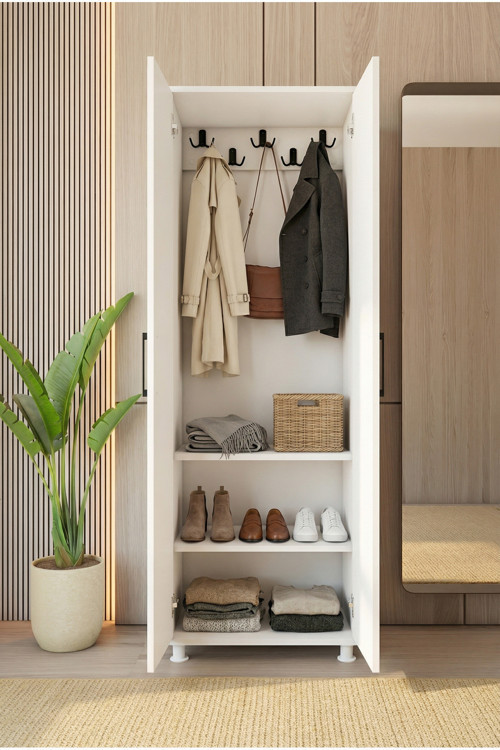 Portmanto Vestiyer — Hol Ve Giriş İçin 3 Fonksiyonlu Düzenleme Çözümü Üst askı bölümü, orta raf ve 2 kapaklı alt ayakkabılık bölümüyle evinizin giriş alanını hem şık hem de düzenli hale getirin.; Tek üründe montluk, şapkalık ve ayakkabılık bir arada.; ✦ Ölçüler: 60 cm (G) x 36 cm (D) x 180 cm (Y) — Ayak dahil, ayak yüksekliği 7 cm ✦ 2 Kapaklı Alt Bölüm — Ayakkabı saklama ✦ Malzeme: 18 mm Parlak Beyaz Suntalem Gövde | Beyaz MDF Arkalık | Beyaz Sert Plastik Ayak 3 Fonksiyon, 1 Ürün: • Üst askı bölümü → Mont, ceket, çanta askısı • Orta açık raf → Şapka, çanta, aksesuar • Alt 2 kapaklı bölüm → Ayakkabı düzenli ve gizli saklama Neden Bu Portmanto? • 60 cm genişlik ile dar hol ve koridorlara uygun • 180 cm yükseklik — standart kapı açıklıklarıyla uyumlu • Kapaklı alt bölüm ile dağınık görüntüyü gizler • Parlak beyaz kaplama her hol dekoruna uyum sağlar Kolay Montaj: Matkap gerektirmez — tornavida ve çekiç yeterli.; 2 paket halinde gönderilir, hırdavat seti ve montaj kılavuzu dahildir.; Kalite & Sertifikalar: 1. Kalite Yonga Levha | TSE | EN | ISO 9001 | FSC | E1 Standardı — Kanserojen madde içermez.; Not: Ürün demonte gönderilir.; Görseldeki dekoratif objeler dahil değildir.; Duvara sabitleme önerilir.