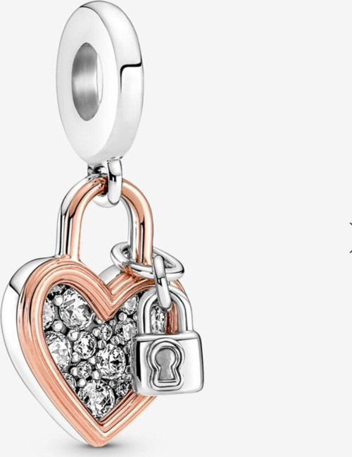 Kalp ve Kilit Çift Sallantılı Charm küçük bir asma kilit ile dekore edildi, dünya çapında aşıkların sonsuz aşklarını ifade etmek için köprülere astıkları anahtarlardan ilham aldı.