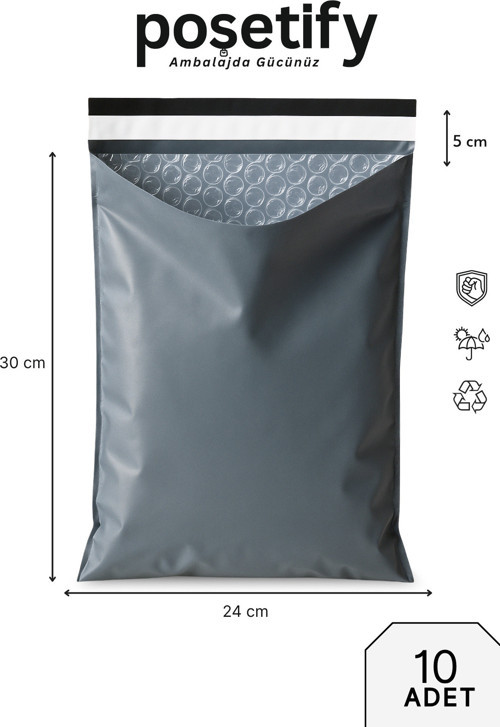 Poşetify Balonlu Gri Kargo Poşeti 24X30+5 cm | 10 Adet | Bantlı Patpatlı Kargo Poşeti | Balonlu Naylon Torba