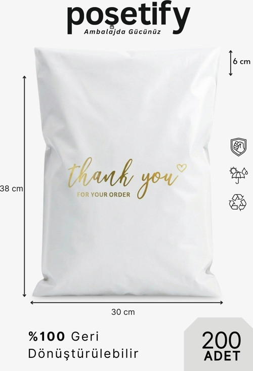 ✨ Ürün Özellikleri A sınıf 1. kalite hammadde Toplam 100 micron kalınlık Tek taraflı 50 micron dayanıklı yapı İç göstermeyen opak yüzey Büyük “Thank You” yazılı özel tasarım Gold detaylı premium baskı Beyaz renk seçeneği Yapışkan bantlı güvenli kapatma Poşetify’a özel üretim