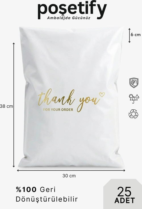 ✨ Ürün Özellikleri A sınıf 1. kalite hammadde Toplam 100 micron kalınlık Tek taraflı 50 micron dayanıklı yapı İç göstermeyen opak yüzey Büyük “Thank You” yazılı özel tasarım Gold detaylı premium baskı Beyaz renk seçeneği Yapışkan bantlı güvenli kapatma Poşetify’a özel üretim