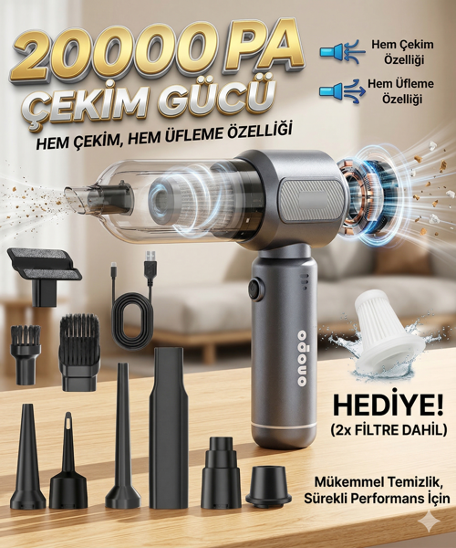 - Onopo Power 20000PA şarjlı el süpürgesi, kompakt tasarımı ve güçlü performansı ile ev, ofis ve araç temizliğinde en pratik yardımcınız! 3’ü 1 arada fonksiyonu sayesinde toz çekme, üfleme ve şişirme özelliklerini bir arada sunar. Çeşitli başlık aparatları ile dar alanlardan geniş yüzeylere kadar etkili temizlik sağlar.