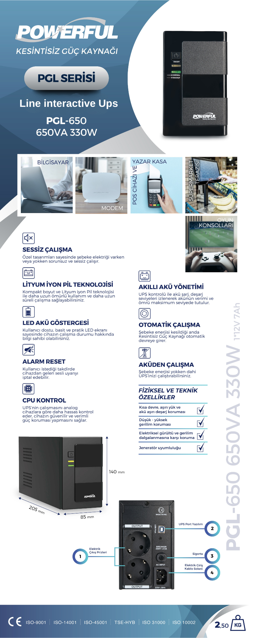 Powerful PGL-650 650VA 330W Lityum Iyon Pil Line Interactive Ups Kesintisiz Güç Kaynağı