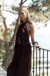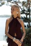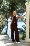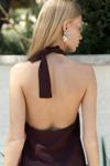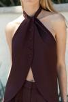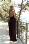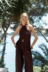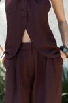 Sırt dekolteli, boyundan bağlamalı, keten karışımlı crop.Pilili, cepli, geniş paça, keten karışımlı rahat pantolon.
