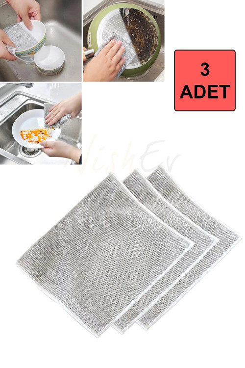 3 adet, 20x20 cm çelik tel bez, mutfak ve banyoda zor kirleri kolayca temizler.
