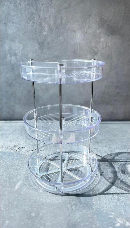 Elpida 3 Katlı Döner Raf Ürün Malzemesi : Plastik Ürün Ölçüleri : Boy 37 cm Çap 23 cm İki Raf Arası Ölçü : 15 cm Ürün Rengi : Şeffaf Dönen raflarla mutfak tezgahınızı, dolap içlerini, buzdolabı içini düzenleyebilirsiniz . Raf içerisindeki bölmeler küçük objelerin daha düzgün saklanmasını sağlar