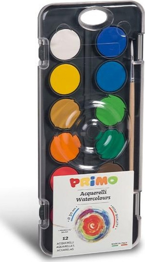 İhtiyacınız olan her şey bu pakette: büyük bir plastik kutu, bir fırça ve 12 güzel sulu boya tableti. Kapağı çevirip karıştırma paleti olarak kullanabilirsiniz.