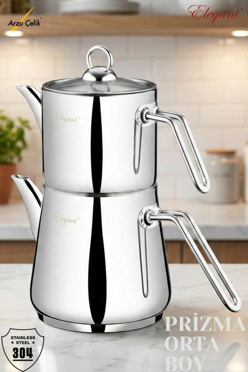 Prizma serisi orta boy çaydanlık takımı, modern ve şık formu ile mutfakta estetik bir görünüm sunar. 304 paslanmaz çelik gövdesi dayanıklıdır. Çelik kulp tasarımı sağlam ve uzun ömürlü kullanım sağlar. Takım; 1,75 L alt suluk ve 1 L üst demlikten oluşur. İndüksiyon uyumlu tabanı sayesinde farklı ocak tiplerinde güvenle kullanılabilir. Ürün Türkiye menşeli olup 2 yıl garanti ile sunulmaktadır.