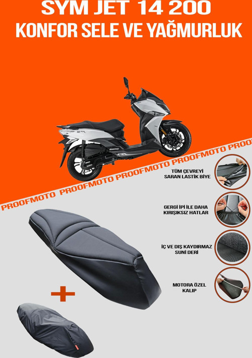 Proofmoto tarafından üretilen bu konfor sele ve yağmurluk kılıfı, Sym jet 14 200 modeline uyumlu olarak tasarlanmıştır.