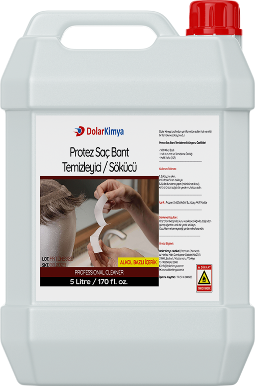 Protez Saç Bant Sökücüsü Temizleyicisi (Alkol Bazlı) | 5 Litre, Protez Saç bantlarınızı kolay, hızlı ve güçlü bir şekilde sökebilirsiniz. Saç derinizde kalıntı bırakmaz. Sabun ve su ile kolayca durulayabilirsiniz. Cildinize zarar vermez. Gliserin içeriği ile cildi kurutmaz, yumuşatır.