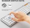 • Makas Anahtarları Sessiz Yazma: Sessiz ve duyarlı makas anahtarları, düşük profilli tuşlar akıcı, dizüstü bilgisayar benzeri verimli bir yazma olanağı sunar. Rahatsız edici seslerin %90'ından fazlasını ortadan kaldıran ve tanıdık yazma hissini koruyan harika bir kablosuz katlanabilir klavye