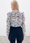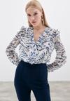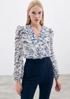 Kruvaze yaka, bel lastikli, altan çıtçıtlı, kol ucu lastikli, birleşik ip askılı astar, desenli, puantiye dokulu bodysuit.