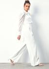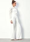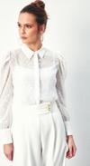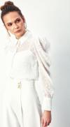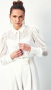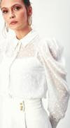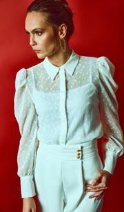 Ön gizli pat, manşetli balon kol, ayrı ip askılı astar, puantiye dokulu gömlek.