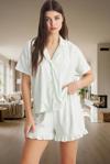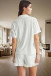 Evinizin rahatlığında şıklığı yakalayın! Puantiyeli deseni ve fırfırlı detaylarıyla göz alıcı bu pijama takımı, yaz aylarının vazgeçilmezi olacak. %90 Polyester, %10 Elastan karışımı kumaş, yumuşak dokusuyla cildinize nazik davranırken, nefes alabilir yapısıyla gün boyu konfor sağlar. Regular kalıbı ve kısa kollarıyla, hareket özgürlüğü sunarken, normal bel şortu ile şık bir görünüm elde edersiniz.