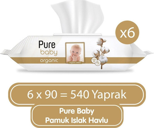 Pure Baby Organik Pamuklu Islak Havlu 6×90 (540 Yaprak) Bebeğin hassas cildi için Organic Pamuk Özlü Lifler kullanılmıştır