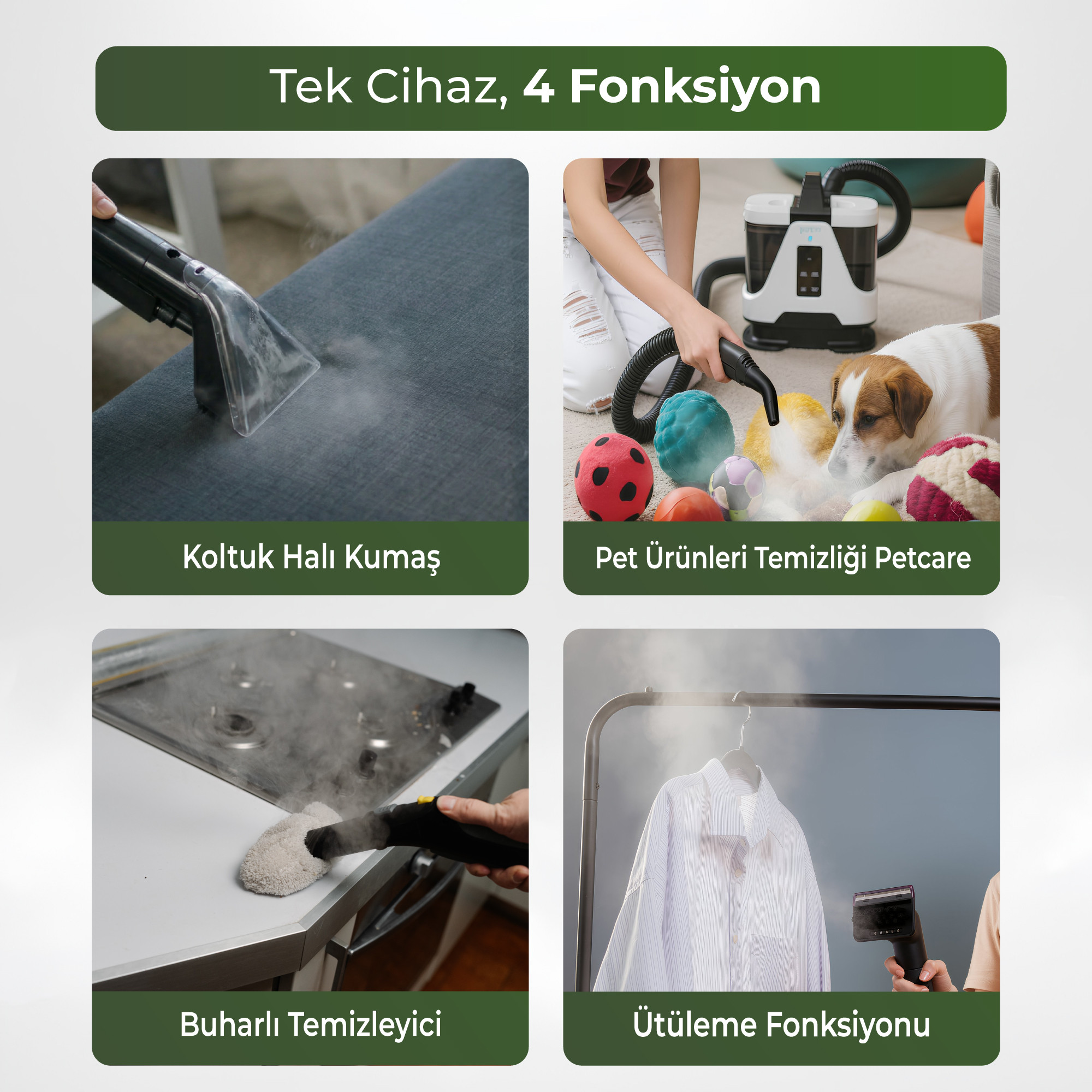 Halı, koltuk, perde ve kumaş yüzeylerde etkili ve pratik temizlik sağlar
