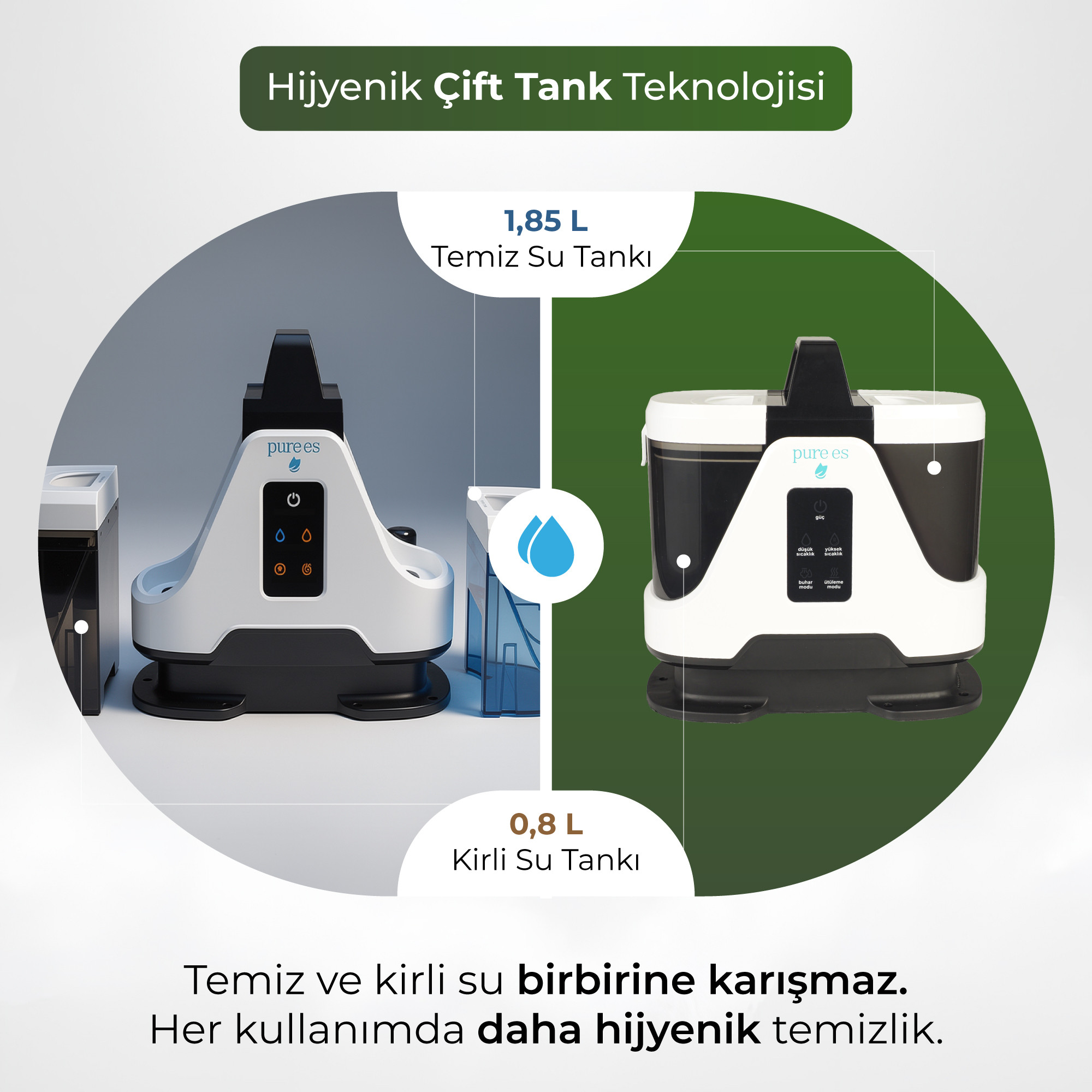 Çift su tankı sistemi sayesinde temiz ve kirli su ayrı tutulur