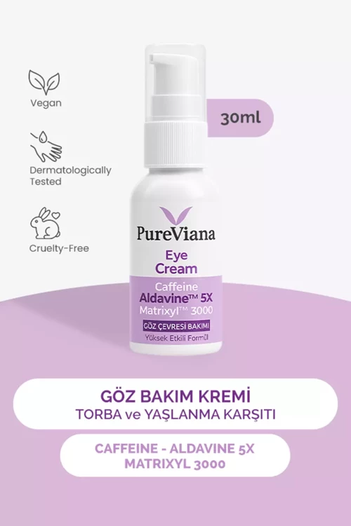 Göz çevresi bakımına özel geliştirilen PureViana Göz Kremi, içeriğindeki Kafein, Matrixyl™ 3000 ve Aldavine™ 5X bileşenleri ile göz altı morlukları ve torbaların görünümünün azaltılmasına yardımcı olur. Panthenol ve Aloe Vera ile zenginleştirilmiş formülü, hassas göz çevresini nemlendirir ve yatıştırır. Hafif dokusuyla hızlı emilir, sabah ve akşam düzenli kullanımla daha aydınlık ve dinlenmiş bir görünüm sunar.