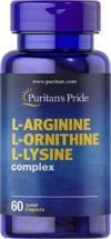 Puritan's Pride L-Arginine L-Ornithine L-Lysine Complex, her bir servisinde 361 mg L-arginin, 225 mg L-ornithine ve 300 mg L-lizin içeren gıda takviyesidir. Gıda takviyesi, kalsiyum ve sodyum ile desteklenmiş forma sahiptir. Ayrıca yapay renklendirici, tatlandırıcı ve gluten içermeyen yapısı ile öne çıkar.