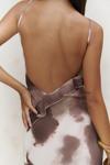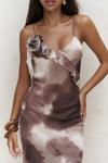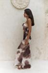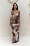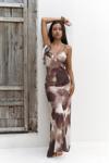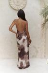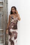 Astarlı, desenli tül, uzun elbise. İp askılı.