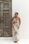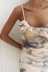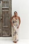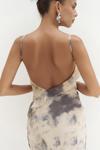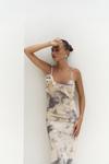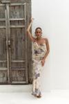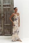 Astarlı, desenli tül, uzun elbise. İp askılı.
