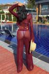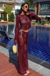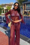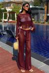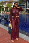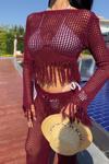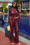 - Zarif bordo rengiyle dikkat çeken püskül detaylı ajurlu triko takım, şıklığınızı ön plana çıkarır.; - Düz deseni ve regular kalıbıyla her vücut tipine uyum sağlayarak rahat bir kullanım sunar.; - Kadın ve kızlar için ideal olan bu takım, günlük kullanım için mükemmel bir seçenektir.; - Triko kumaşı sayesinde yumuşak dokunuşu ve konforlu yapısıyla gün boyu rahatlık sağlar.; - Uzun boy tasarımı ile hem şık hem de sıcak tutan bir görünüm sunar.; - Bisiklet yakası ile modern ve minimalist bir stil oluştururken, casual ortamlarda da tercih edebilirsiniz.; - Tunik-pantolon kombini olarak tasarlanmıştır; böylece iki parçadan oluşan setle bütüncül bir görünüm elde edersiniz.; - Kolay bakım imkanı sağlayan yıkama talimatlarına sahip olması pratikliği arttırır.; - %100 akrilik materyali sayesinde dayanıklılığı artırırken aynı zamanda hafifliğiyle konforunuzu korur.; - Her mevsime uygun olarak tasarlanmış tüm sezonlarda giyilebilen bu takım, gardrobunuzda vazgeçilmez bir parça haline gelir.