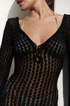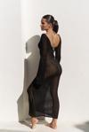 Uzun kollu, göğüs derin v yaka bağlama detaylı, uzun triko elbise. Kolalrı geniş kesim ve dokulu kumaş. Astarsız.